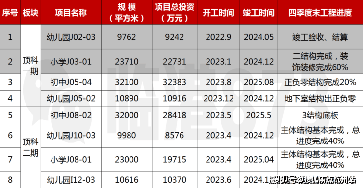 顶科社区公建配套学校建设计划:上实•听海毗邻的J10-3地块幼儿园计划24年12月竣工,J08-01小学和J08-02初中分别计划在25年4月和5月先后竣工。