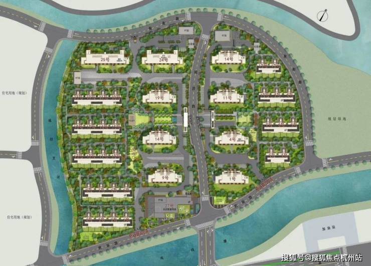 项目容积率仅1.8,由9幢6F叠加别墅+9幢17F墅境高层组成,叠墅东西两侧临河分布,整体高低错落布局,采光佳,视野好。
