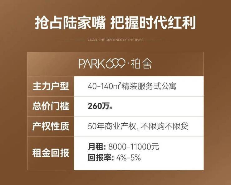 在商业合作、个人信贷甚至社交场景中,拥有一套位于陆家嘴核芯的整栋产权服务式公寓,本身就是一种信用的加持。 PARK699代表着现代、高效、有品质的生活方式——直线5公里接驳陆家嘴“三件套”,步行300米直达140公顷世纪公园 。这种“资本漩涡”与“城央绿肺”的零秒切换,正在成为新一代高净值人群的“社交名片”。