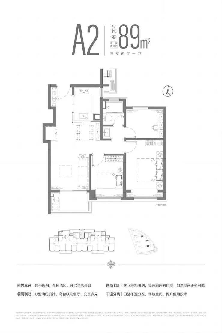 建面约89平的三房两厅一卫, 400万级别主打低总价, 三开间朝南,通过S墙的设计解决了冰箱空间问题。