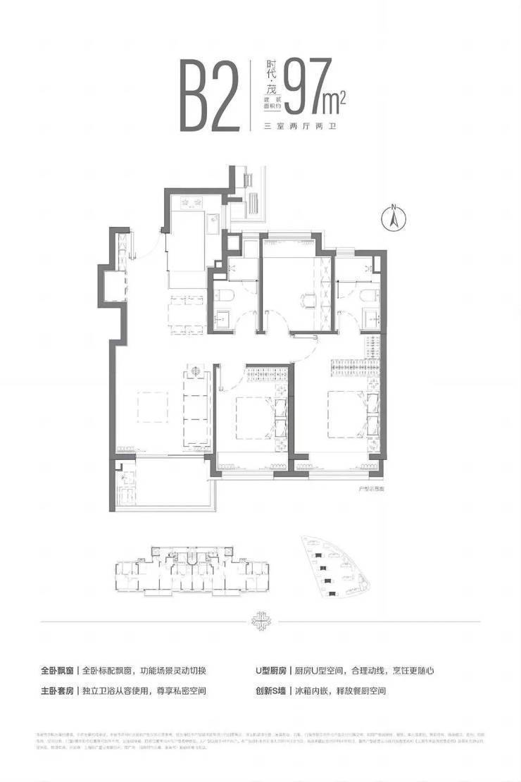 建面约97平的三房两厅两卫,在89户型基础上多了一个卫生间, 450-500万级别功能性更强。