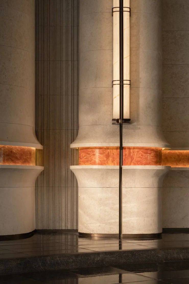 招商序藉由“吴淞灯塔”及其形制,原创落客雕塑“源流”,保加利亚进口的沉香米黄石材的底座,搭配以安哥拉黑大理石、云石玻璃,营造温润归家昭示。此外,招商序还寻访各地,精选伊朗进口水墨玉天然石材、橙皮红石材等,运用于通高大门、迎宾楼背景墙等处,品质感尽显。