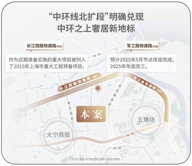作为上海市重大工程,「中环北抬」通过军工路、长江西路、沪太路三条快速路互联,重构浦西北交通骨架。这项工程不仅延伸中环线,更通过立体路网打造串联宝山、杨浦、静安的「城市交通脊梁」,竣工后将形成复合功能交通带,推动沿线板块价值升级。