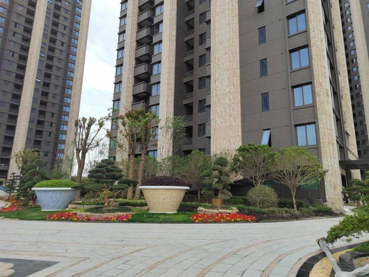 社区外部沿街绿化景观,由 多重花坛组成,搭配大小灌木和香樟等名贵树种 ;