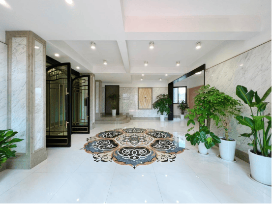 每栋楼也都是 地上地下双入户大堂 的设计,一层入户大堂地面采用了 曼陀罗拼花 造型,而且都是纯手工切割技术打造的定制款,造价颇高