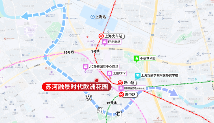 苏河融景整个小区由汉中路、长安路、普济路与恒丰路围合,临近汉中路地铁站和苏州河滨河景观带。苏河融景整个小区分2期开发,其中1号2号一期开发,其余楼栋二期开发。