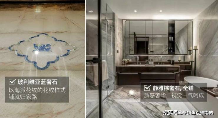 从私家电梯厅开始,地面局部点缀皇家蓝的玻利维亚蓝奢石,号称奢石中的爱马仕,并刻成海派花纹的样式,优雅又具仪式感。