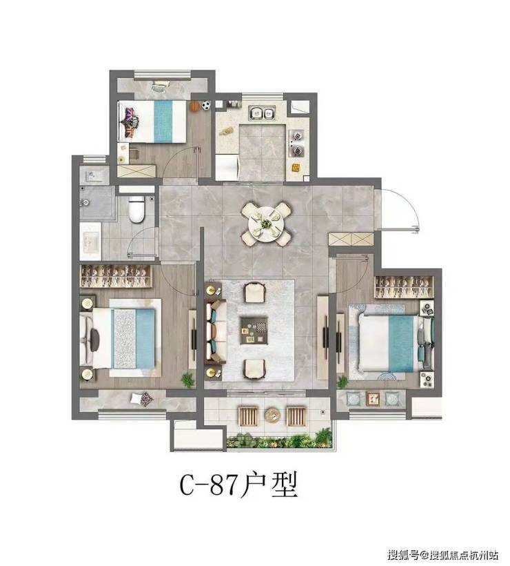 ✨上海云湖壹号官方售楼处电话:400-8080-420建筑面积约87㎡三房户型,可谓云湖壹号的“头牌明星”。三开间朝南,南北通透,所有卧室均带飘窗,不管是采光、通风、还是视野,这个户型都无懈可击。