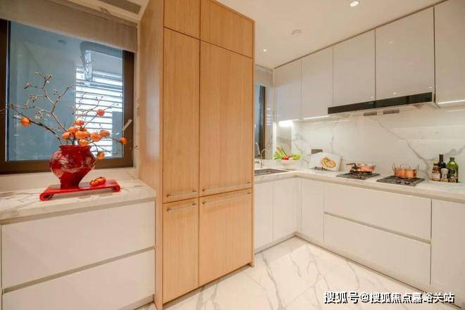 厨房采用洄游式立体布局,一半是 “工作厨房” ,隐于内部的中式厨房,有效避免油烟外泄,无论烹炸煎烤,空间之外清新依旧。