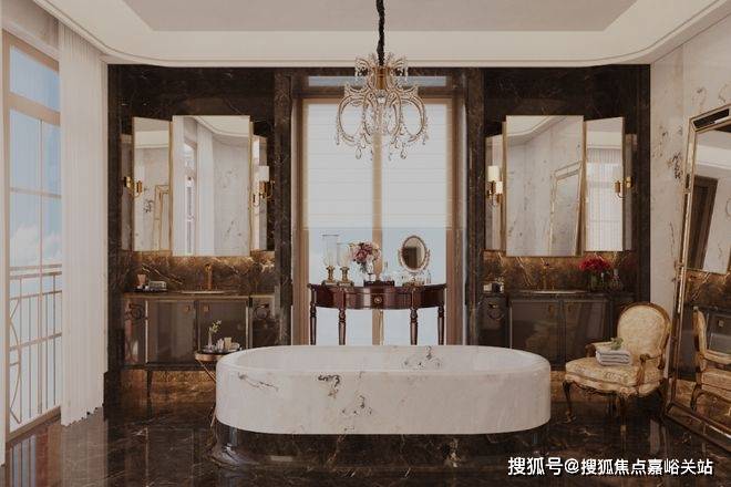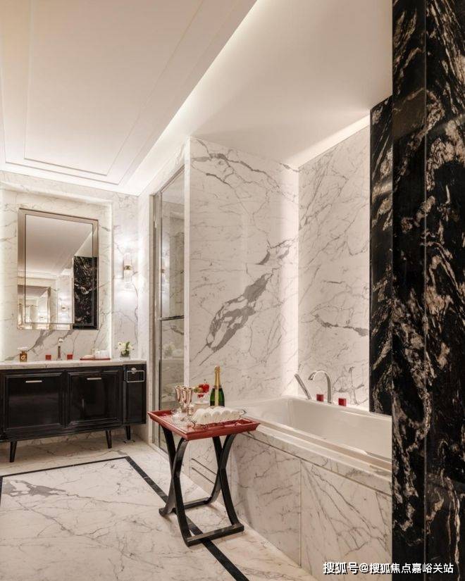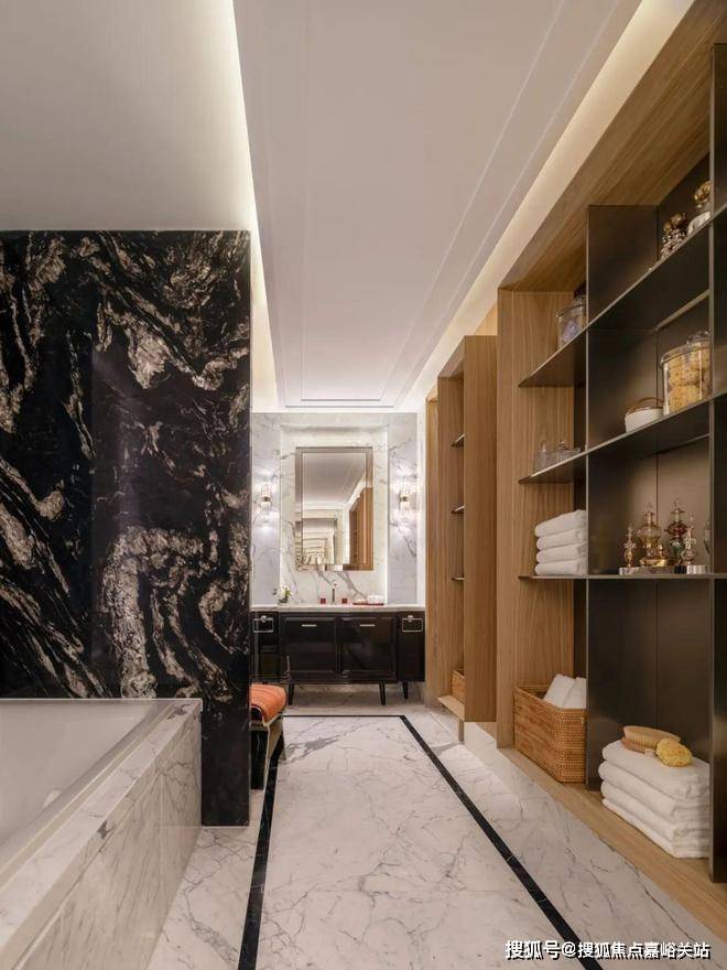秩序,是主卫浴空间布局的重点。 两个独立台盆相对而立,分属男女主人,营造出从容自如的使用体验。大面积运用黑白撞色大理石,让空间的秩序美与材质的自然美融合,颇具观赏韵味。