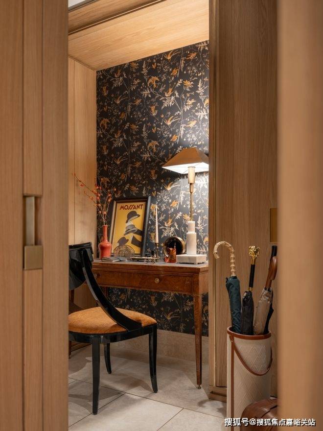 天潼198官方售楼处电话☎️☎️:400-8800-430 玄关具有变化性与功能多重性,壁纸融合中西方色彩和纹样,除了更衣功能,更摆放了古董书写桌,以手写文字传递信息,传递慢节奏生活方式,丰富空间的装饰和功能,目光所及视角变得丰富。天潼198官方售楼处电话☎️☎️:400-8800-430