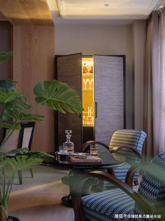 客厅另一端,是连接房内与外景的介质空间,在这里主人和客人可以享受美酒雪茄。看似独立的空间,实际延伸了客厅的功能,也延伸了窗外景观到室内的视线。