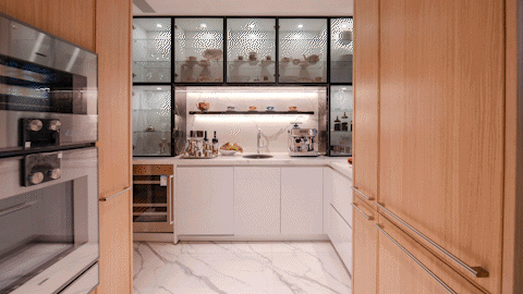 另一半是 “社交厨房” ,显于外部的西式厨房,与餐厅保持良好的视线关系,烹饪西餐的同时可与亲友无碍交流互动,分享乐趣。安置一组玻璃柜,便于展示主人的藏品餐具,让厨房也成为艺术的浸润之地。