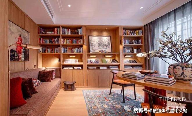 可坐可卧的软塌,让书房升级为舒适安逸的精神领地。一杯咖啡,一本好书,一张黑胶,消磨一段悠闲的午后时光。
