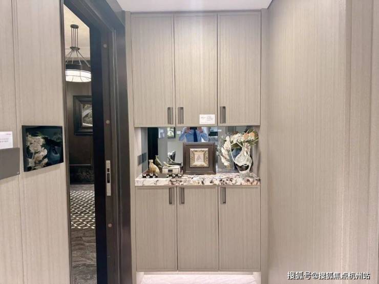 餐厅区域放置一个餐边柜,同样选用了雪山飞狐奢石做透光台面设计,餐边柜在收纳储物方面具有显著作用。