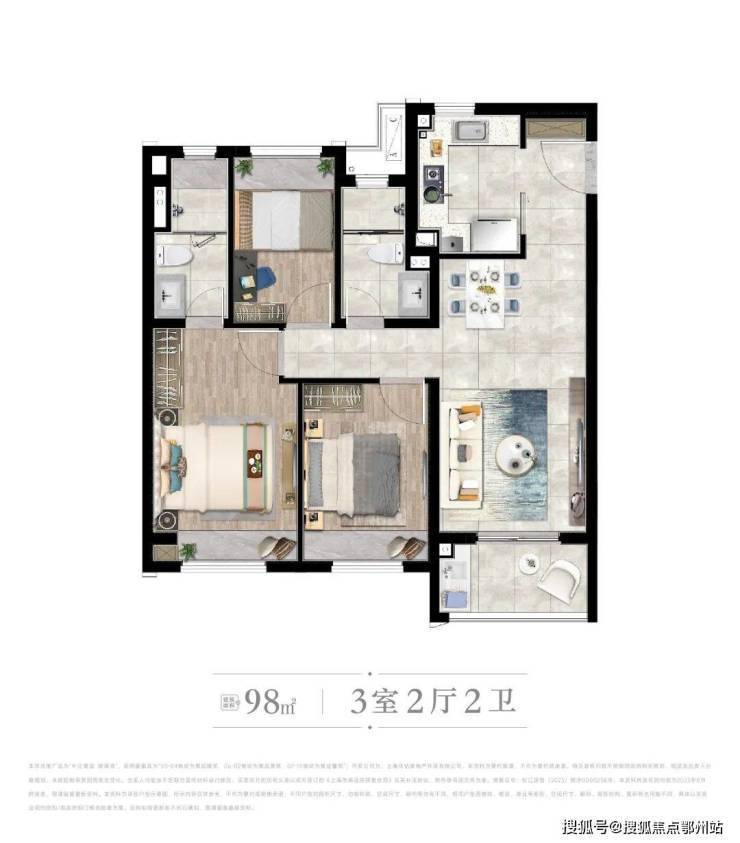 [ A户型 ] 建筑面积约98㎡ | 3房2厅2卫