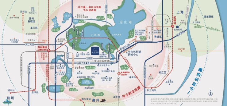 项目地处长三角一体化示范区的核心位置,北依元荡湖生态绿核,南邻水乡客厅生态绿色功能样板区。距离在建的上海示范区线水乡客厅站仅约1.2公里,通车后3站即可直达虹桥枢纽;苏州南站(汾湖站)经沪苏湖高铁、通苏嘉甬高铁,8分钟到松江,20分钟达上海虹桥。此外,社区还提供班车接驳上海地铁17号线东方绿舟站,方便居民出行。对于在上海或苏州工作的购房者来说,这里实现了“工作在上海,生活在湖畔”的理想生活模式。