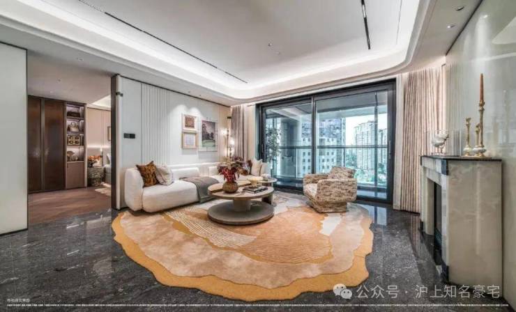 卧室则铺设海派鱼骨拼花地板,借木质肌理的温润与细腻,营造出私密领域的宁静氛围!这种“公区显质感、私域藏温度”的材质分区逻辑,恰是高端住宅设计中至关重要的一笔!