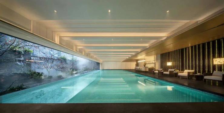 古驰黑奢石与非遗琉璃共筑的背景墙,映照着窗外由天然岩皮与奢石砌成的三级瀑布。羽毛枫在岸边隔窗静立,泳池全地暖设计,恒温脉冲水流轻抚肌肤,并于岸边打造镜湖春晓奢石、搭配贝壳艺术背景墙设计的酒店式水吧台休憩区,布置全套安缦御用的HARBOUR户外家居。【溪谷泳池】游弋其中,是一次对自然与艺术的全身心沉浸