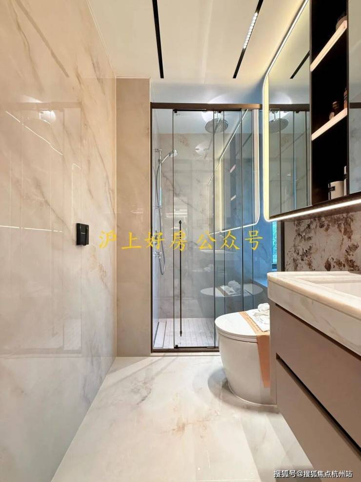 A户型连主卫都配270°转角飘窗,西侧直面杨浦内环新貌,西南侧远眺三件套,城景与生活无缝衔接。