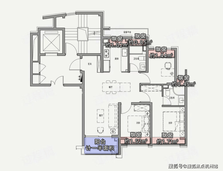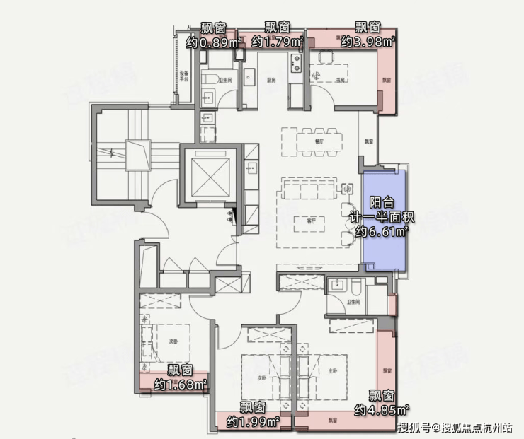 项目百平三房,在计算阳台一半面积+飘窗赠送面积的情况下,实得率可以达到91%左右,完美覆盖了当下普通高层的得房率痛点。