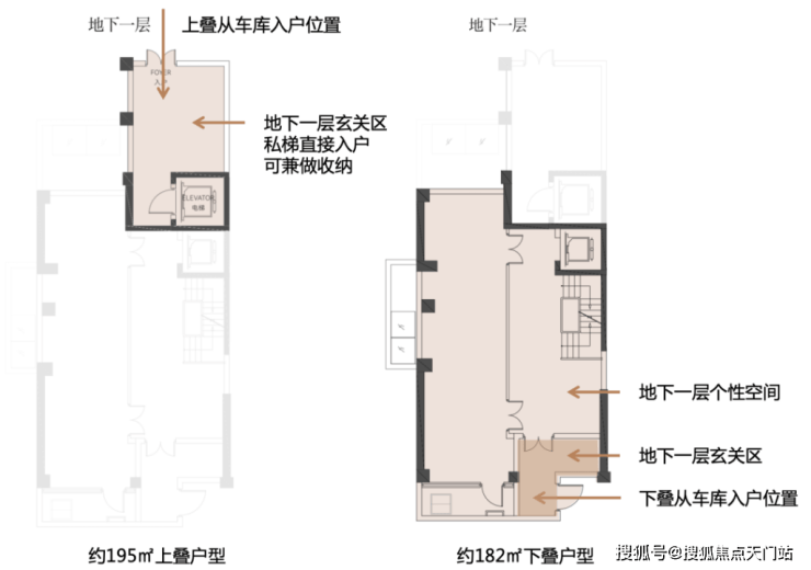 每套叠墅均有地库直接归家动线。无论是上叠还是下叠,都在地下一层有独立专属门厅,且面积不小。