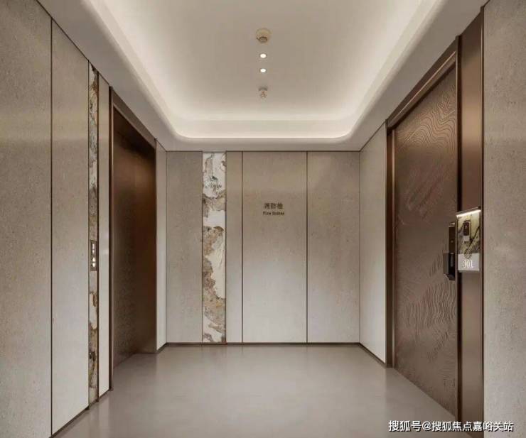电梯厅融合梵高印象岩板与超白洞石大面积的铺装,彰显出了细腻雅致!