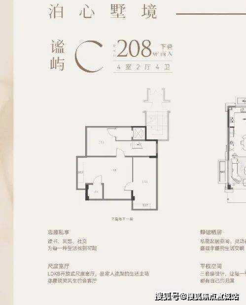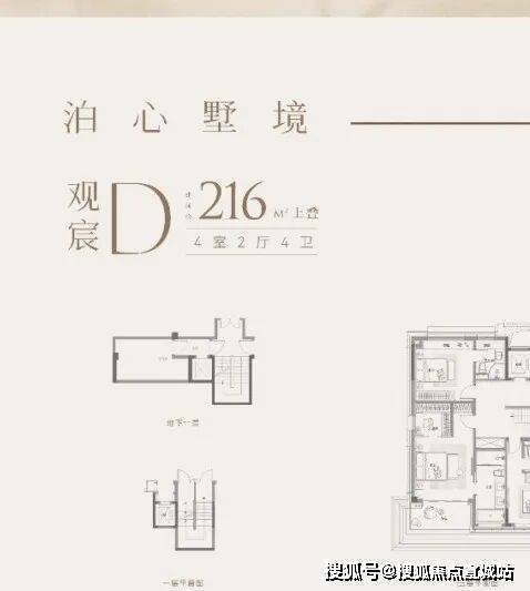 户型特点:下叠边套,南向面宽约9米,客餐厅同宽约5.8米,空间开阔。一楼设南向卧室,采光好且视野佳。二楼为三套房+主卧总统套房设计,主卫南向,可容纳浴缸和双台盆。地下室方正,附赠采光井,利用率高。