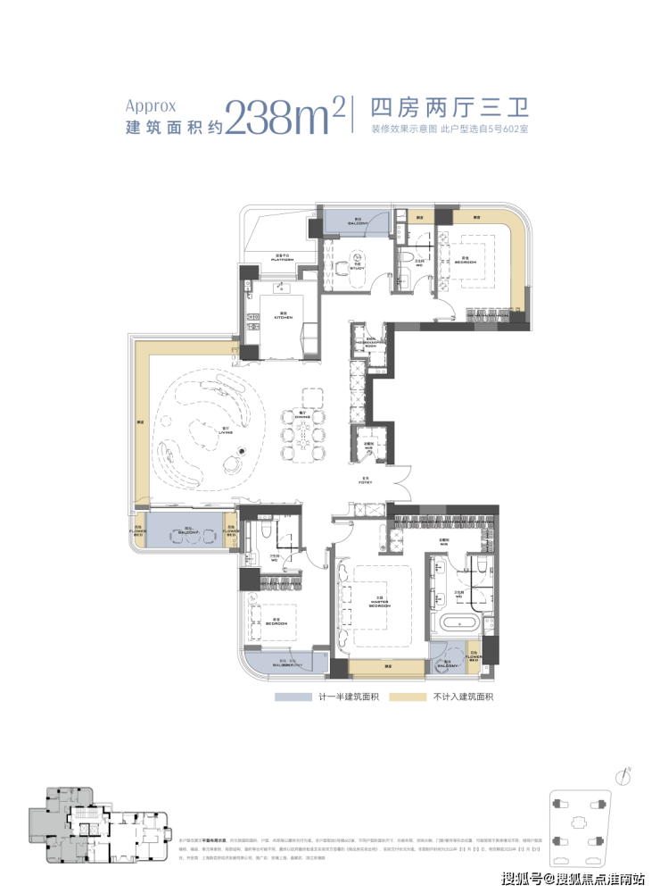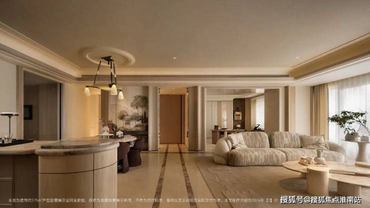 比如这个建面约238㎡户型,采用环幕设计,将徐汇滨江城市景观、下沉庭院等自然与人文景观尽收眼底,营造沉浸式居住体验。