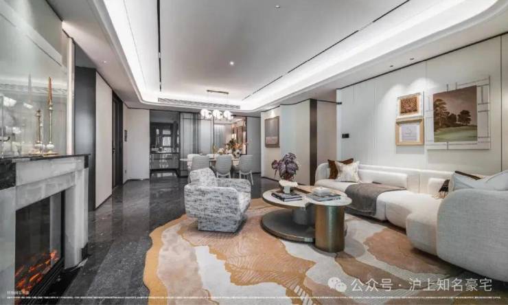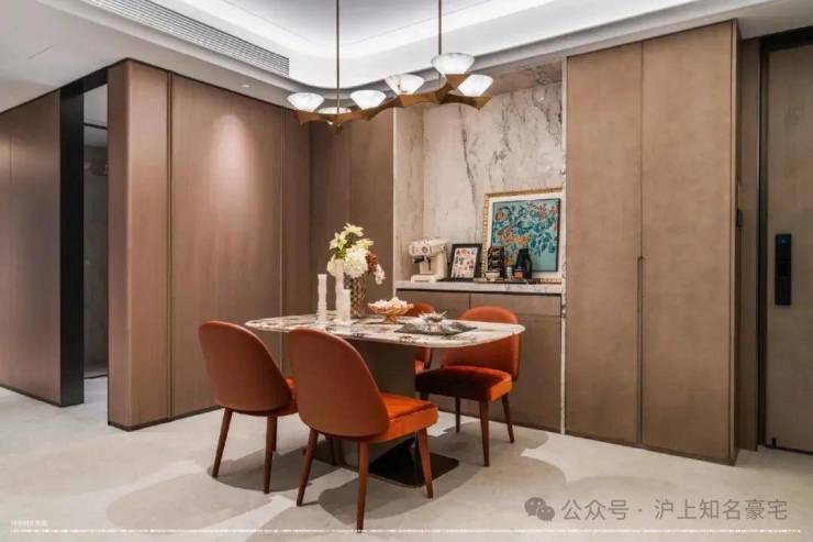 卧室则铺设海派鱼骨拼花地板,借木质肌理的温润与细腻,营造出私密领域的宁静氛围!这种“公区显质感、私域藏温度”的材质分区逻辑,恰是高端住宅设计中至关重要的一笔!