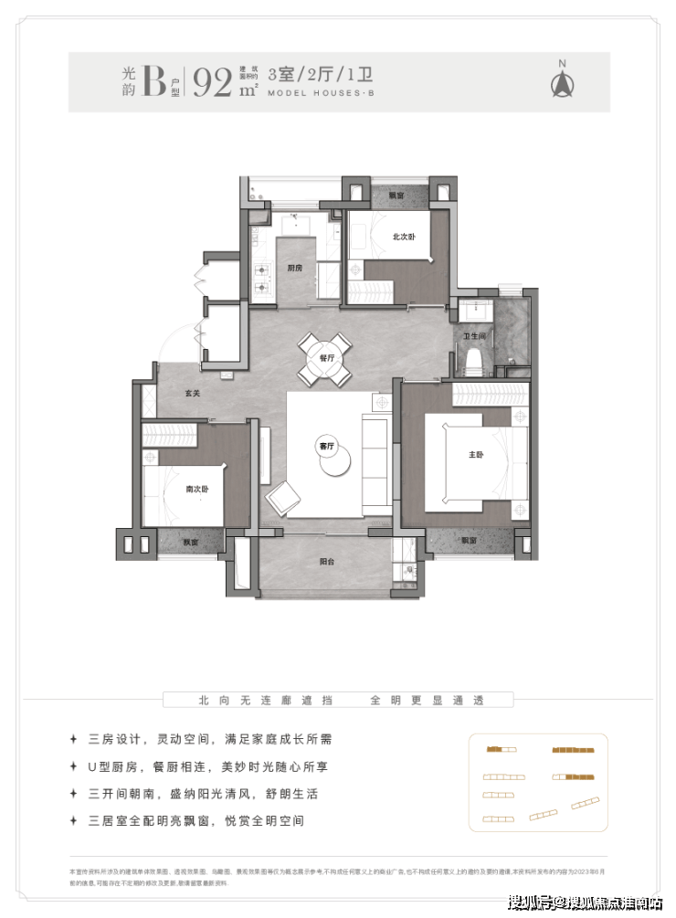 且客厅-餐厅-阳台-厨房一线连通,能真正实现南北通透。