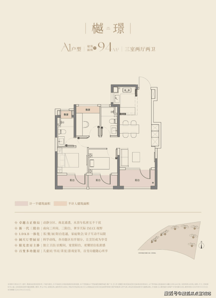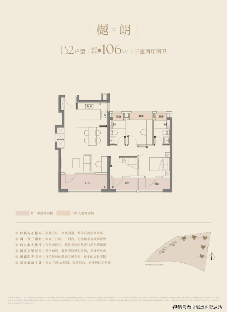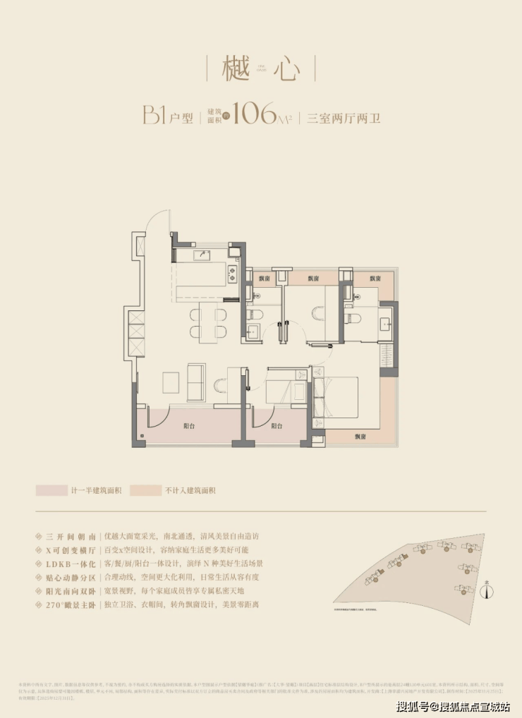建面约106㎡的三房两厅两卫,3.5开间朝南,南向面宽达到约11.8m!碾压市面上以前的三开间朝南、10米面宽的三房户型。