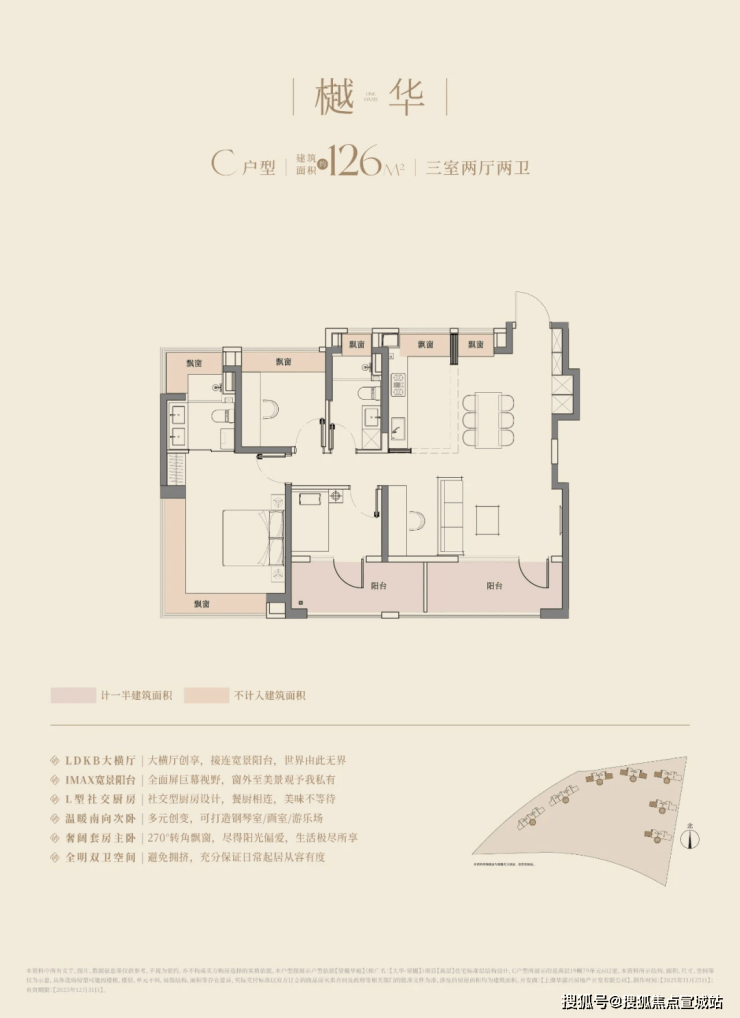 建面约126㎡三房两厅两卫,南向的总体面宽达到惊人的约13.2m,可以媲美市面上很多150㎡起步的豪宅产品的面宽了。