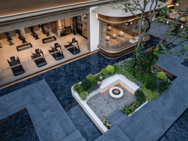 项目跳出简单的绿化堆砌,打造罕见“云台叠境”立体园林,三重台地搭配跌水、观景平台、下沉卡座与花厅,一步一景。将酒店式的仪式感与隐秘感实景落地,让效果图里的诗意,变成日常风景。