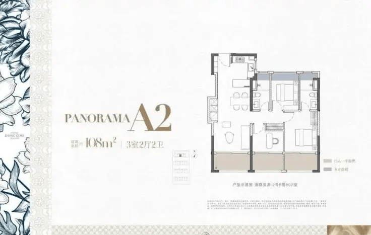 三开间朝南,南向总面宽达10.2米,三个功能分区阳台总面积10.08㎡,实得率高达87%,空间感等同市面约120㎡户型。