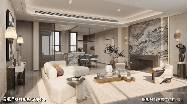 约1500m²恒温泳池会所及落差达约10米的水幕下沉式园林的打造,在奢石、臻材等元素的空间应用中,让显贵世家的社交场景,相映于粼粼碧波的柔光之中,于方寸之间游离世外。
