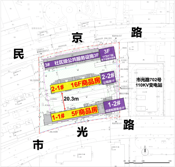 项目四至范围:东至002-06地块、南至市光路、西至居民小区、北至民京路。项目总用地面积约7458.94平方米,容积率2.3,计容面积约17155.56平方米。装标3000元/m²(集采价)。
