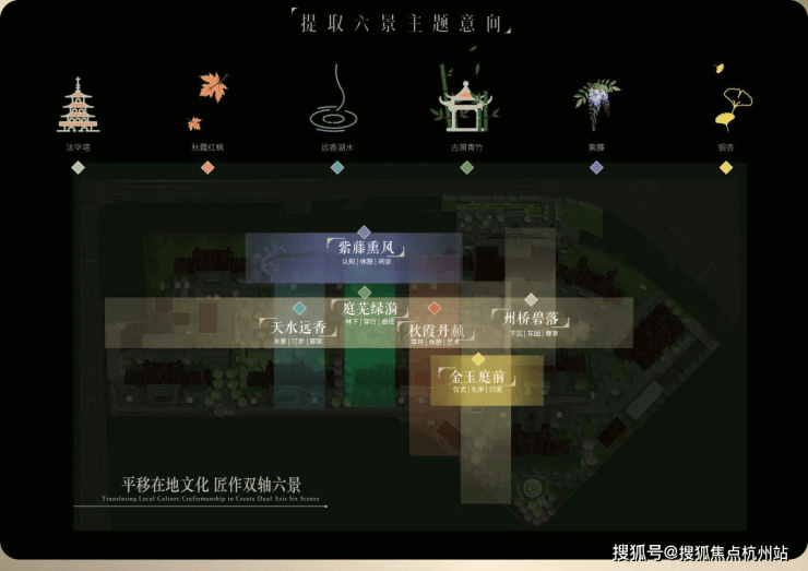 项目园林对轴线的运用同样出彩,堪称神来之笔的“双轴六境”,由 “礼序归家轴+景观漫步轴” 纵横交织,融在地文化,以“非遗”竹编形制,铺陈园林步道,同步淬取 “州桥壁落”、“紫藤熏风”、“天水远香” 等嘉定古今6景,提炼细节元素及专属色系,营造主题园林空间。