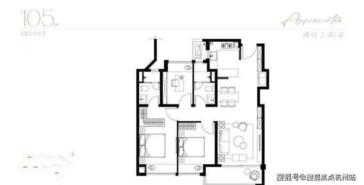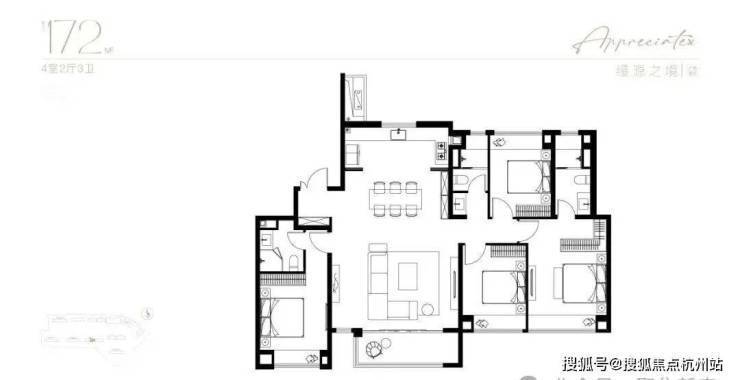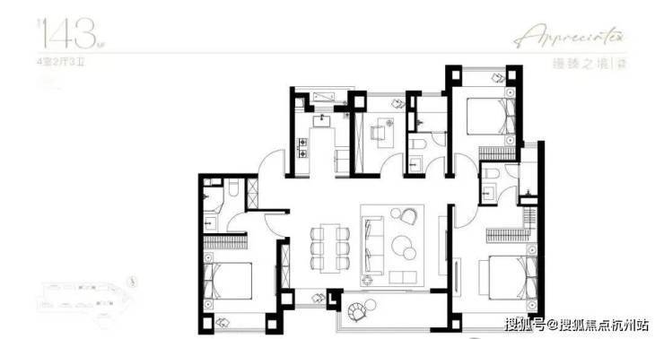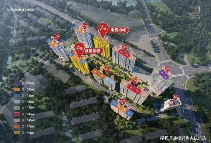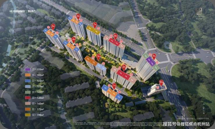 主力建面105-198㎡,3-4 房,得房率77%-82%,空间利用率高