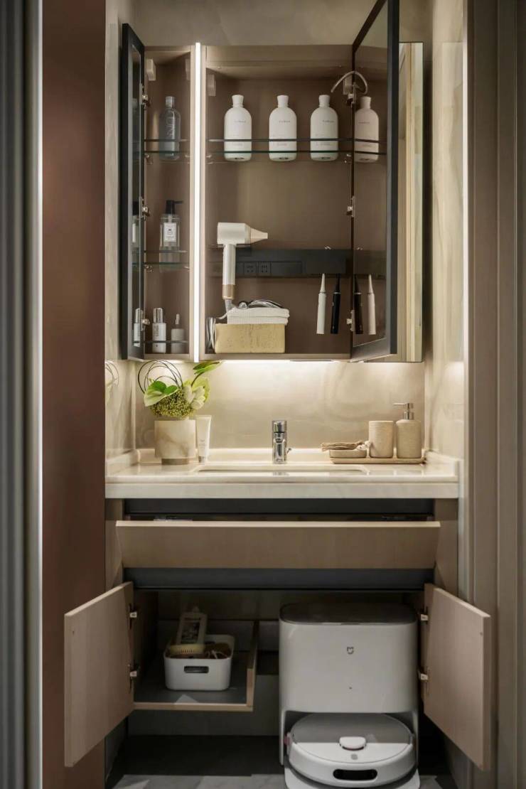 卫生间镜柜与预留洗地机位的台下柜,方便清洁用品的收纳,创造独立的家政清洁收纳空间。内嵌LED灯带的防雾镜柜,方便沐浴后的护理与美肤。