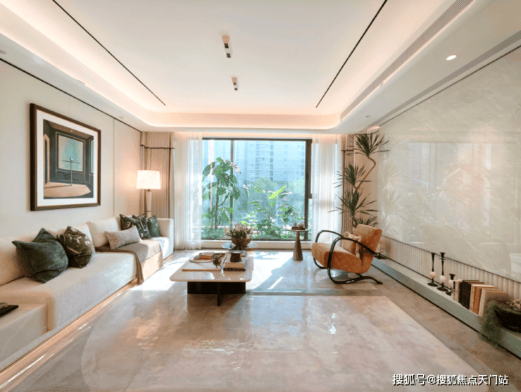 约5米 超大宽厅设计,约9米纵深,餐客厨的空间大 约在43㎡ 左右,空间感媲美市面上120㎡的户型。
