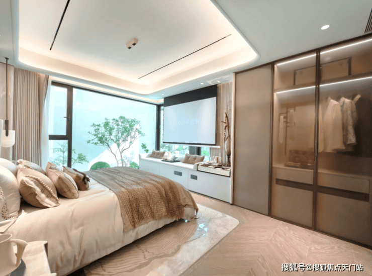 主卧套房式设计+带独立衣帽间+270度转角飘窗, 尊崇感与私密性拉满。
