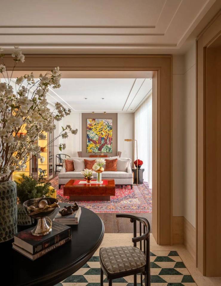 入户空间由一个简约的门厅和楼梯厅组成,门厅配有控制台和嵌入式衣柜。以多功能圆桌为中心的楼梯厅连接着楼梯、电梯、客用卫生间和客厅。空间采用白色洞石搭配特制染色的胡桃木,其浅色调与洞石和谐呼应,同时保留了胡桃木独特的纹理特征。
