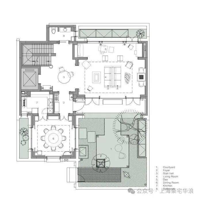 入户体验始于私家庭院。在高密度的城市环境中,庭院为住宅提供了一处解压之地,一缕新鲜空气。因此,在平面布局上,我们将所有重要空间布置在庭院周边,以充分利用庭院空间。