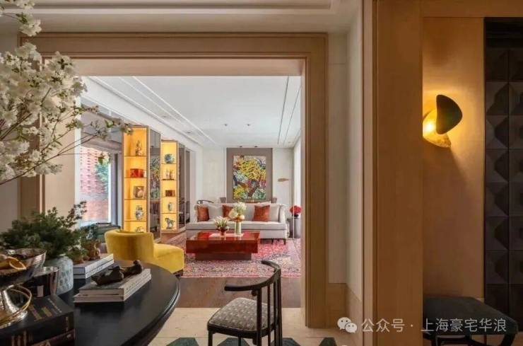 在客厅中,两个展示架巧妙地将空间分隔成主客厅区和休闲室,营造出一个与建筑尺度交相辉映的层次空间。