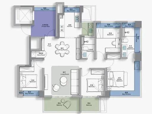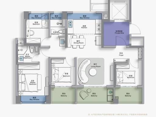 主卧:270° 飘窗、步入式衣帽间、双台盆卫浴