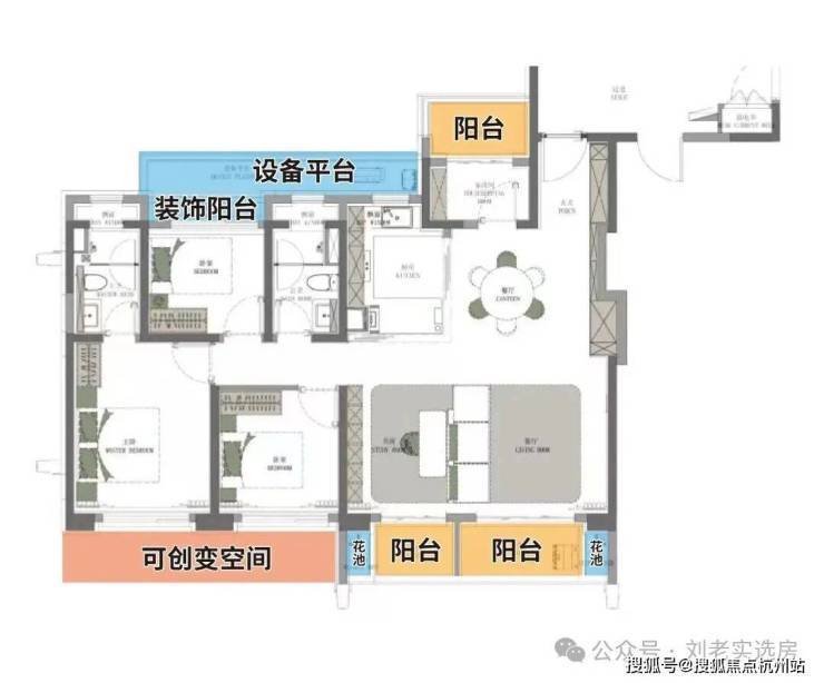 建面约122㎡3房,这个面积做3房,同时还附加了3阳台+飘窗+可创变空间等优势。