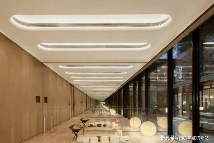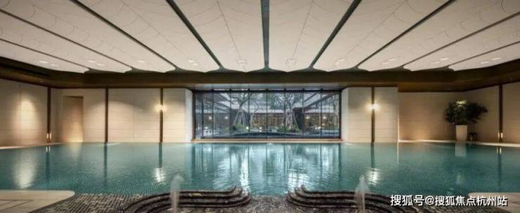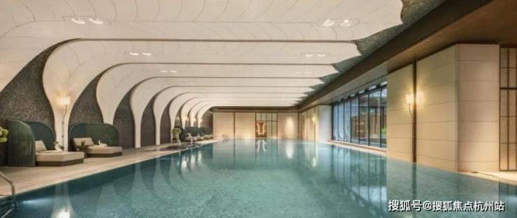 恒温泳池:第一,采用了景德镇烧制的陶瓷马赛克,独特的釉面色彩由景德镇老师傅手工浇筑而成,充满人文艺术底蕴;第二,羽毛天花造型,由600余件铝板打造,表面采用了仿贝壳纹的艺术漆处理,带来松弛度假感;第三,不仅配置了约25m×10m的4道泳池,还采用了奥运会同款空调除湿系统,彰显高档品质细节!