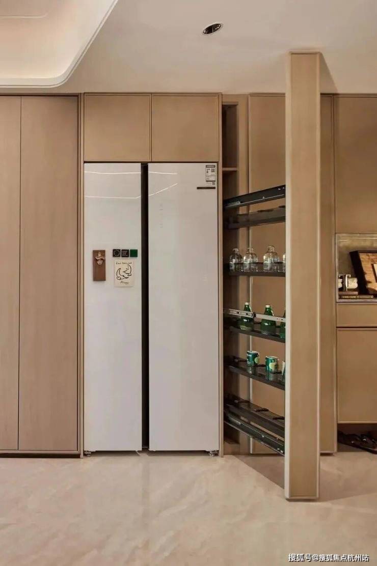 4.创新S墙分户设计,让收纳系统从平面延展为立体暗线,通过玄关柜、冰箱柜、零食拉篮的巧思,用立体空间创造更海量收纳!