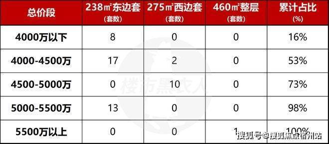 也就是说,在这51套房源里,真正的主力成交区间,大概率还是会落在4000-5300万区间之内。顶平负责拔高想象,常规房源负责兑现成交,这个结构非常清楚。如果把这51套房源按总价带拆开,你会发现货量配置其实非常聪明。